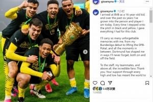 小雷纳社媒写道:“我16岁时加入多特蒙德,过去6年间我成长为如今的球员,每次身披黑黄战袍踏上球场,我都为这家俱乐部倾尽全力。